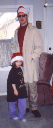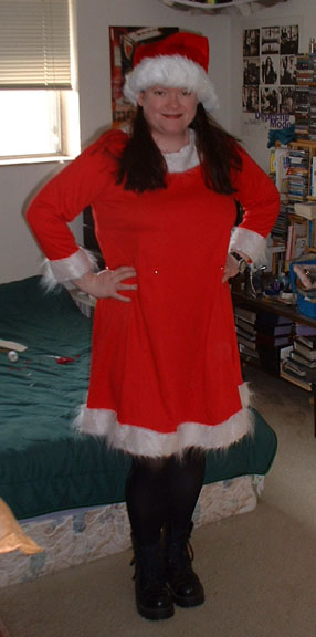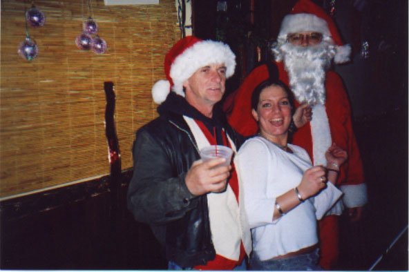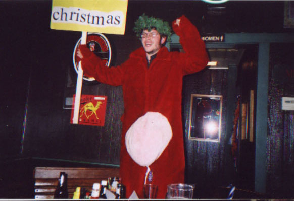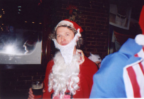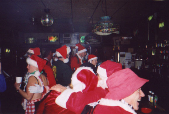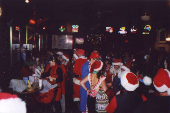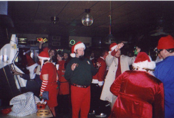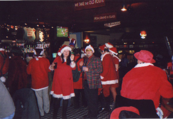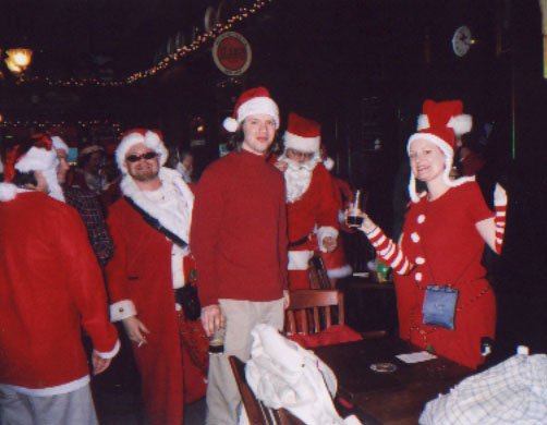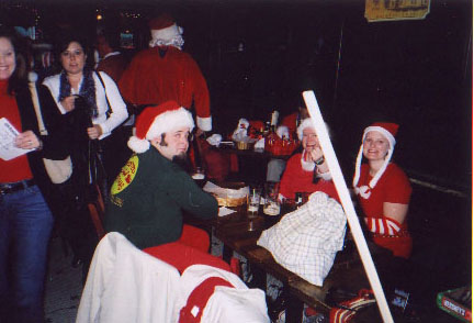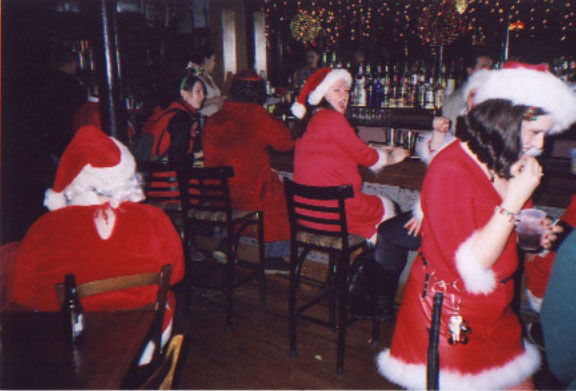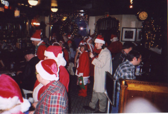 Tom conducts some caroling Santas as other Santas pick out tunes on the jukebox.