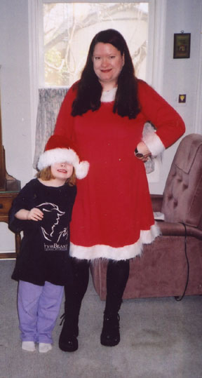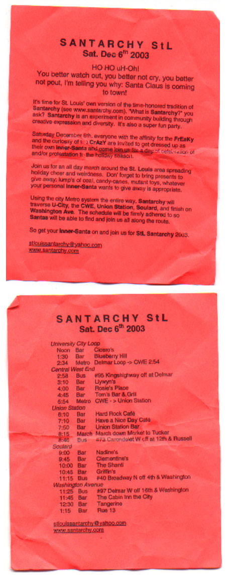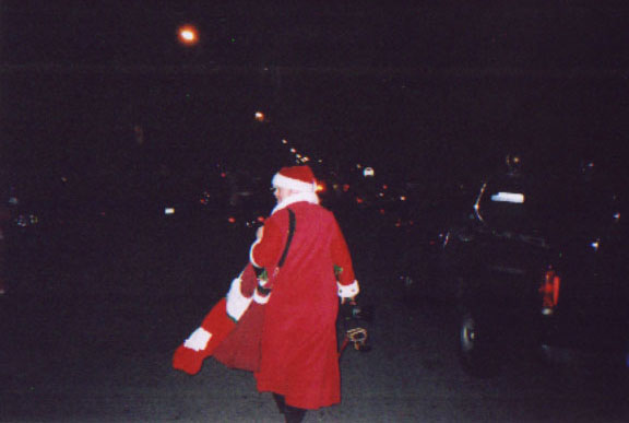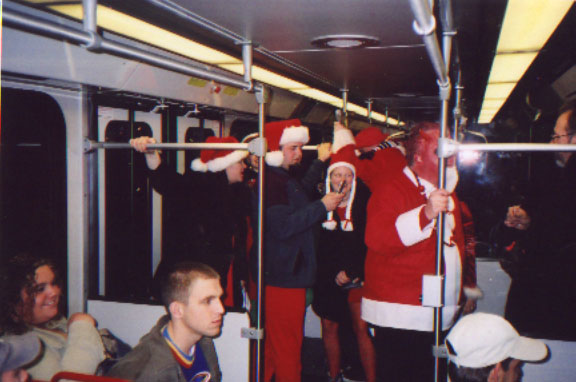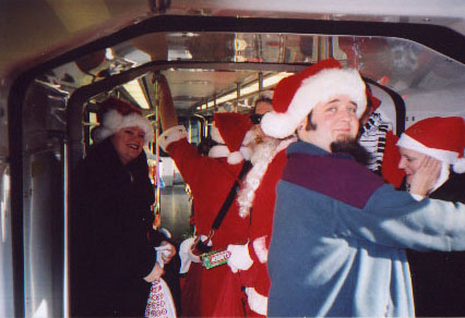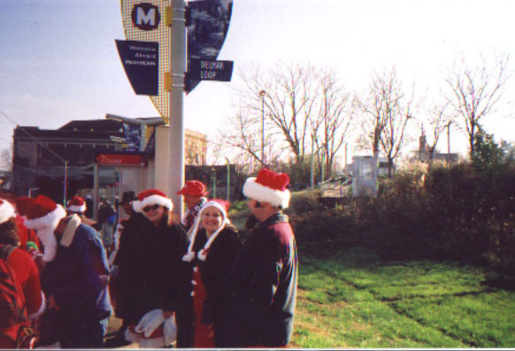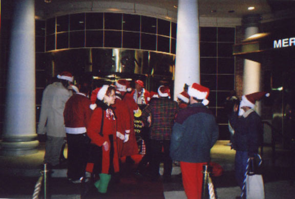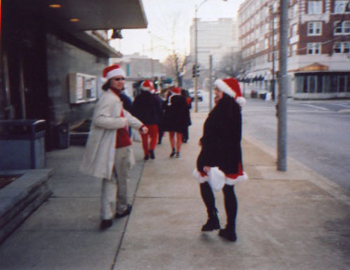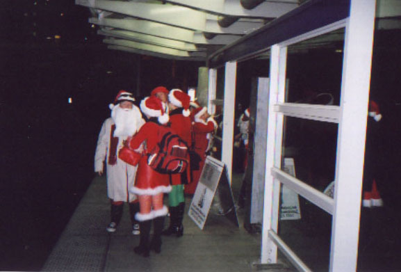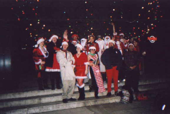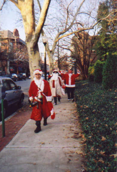 Santas en route to Rosie's Place, singing "You better watch out, you better watch out..."